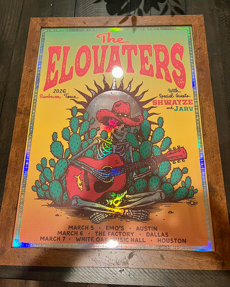 Lightning has struck twice! Last year, about this same time, I was stoked and honored to have been able to do a gig poster for one of our favorite bands The Elovaters. In a "just like last time" sorta way, we got the email for the upcoming dates and Texas was right at the start of March, and more importantly for those of us that are "crowd adverse", NOT during South By Southwest in Austin. So I sent off an email to the same fine folks I sent an email off to last time and asked, "Hey, can I?" and again, they said,"Maybe, let's see something". So I scribbled some sketches and sent them their way, got some direction, tightened things up, and nailed em down, before I knew it, everyone said,"Cool!", then, EVEN better, I got asked, "Hey, the guys were wondering if it would be possible to use this for all the Texas dates?". "Um...yes...yes, that would be possible! Are you freaking kidding me?!?!" I thought. "Sure, that'll be cool" I said. "They thought it would look cool on foil too, what do you think?". "If that's what they want, sounds good to me." Wow! Mind sufficiently blown.